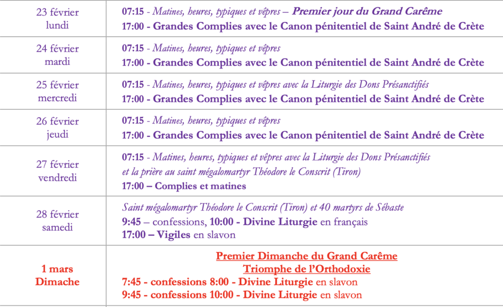 ANNONCE: LES OFFICES DE LA PREMIÈRE SEMAINE DU GRAND CARÊME